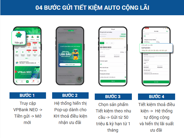 Khách hàng chưa từng gửi tiết kiệm tại VPBank (bao gồm kênh trực tuyến hoặc tại quầy) thực hiện mở mới thành công khoản tiền gửi đầu tiên trong thời gian diễn ra chương trình qua kênh trực tuyến VPBank NEO
